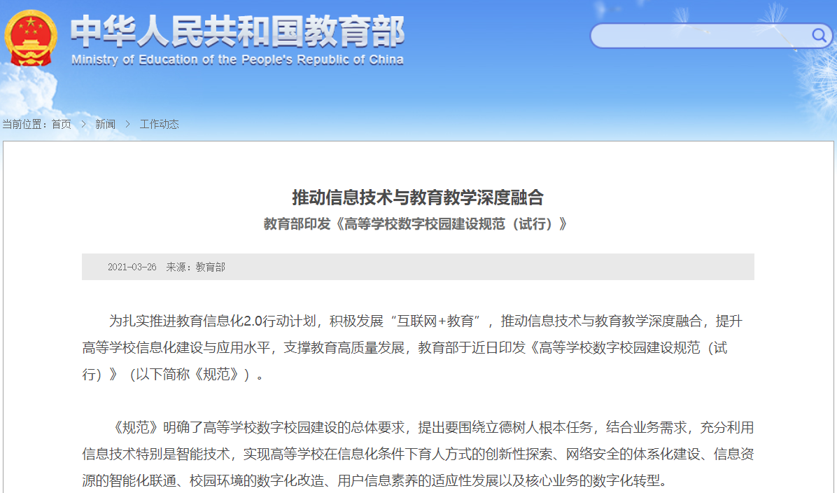 為扎實推進教育信息化2.0行動計劃,積極發展“互聯網+教育”,推動信息技術與教育教學深度融合,提升高等學校信息化建設與應用水平,支撐教育高質量發展,教育部于近日印發《高等學校數字校園建設規范(試行)》(以下簡稱《規范》)。